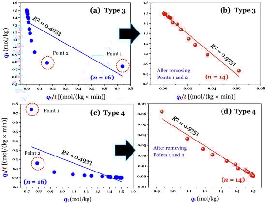 The linear forms (Type 3 and Type 4) of the pseudo-second-order model (a,c) before (n = 16) and (b,d) after (n = 14; Points 1 and 2 removed) data manipulated.