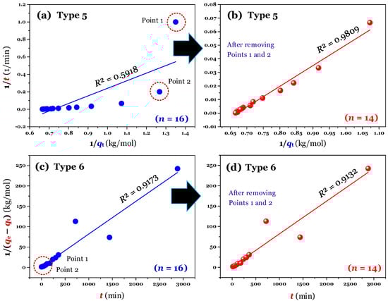 The linear forms (Type 5 and Type 6) of the pseudo-second-order model (a,c) before (n = 16) and (b,d) after (n = 14; Points 1 and 2 removed) data manipulated.