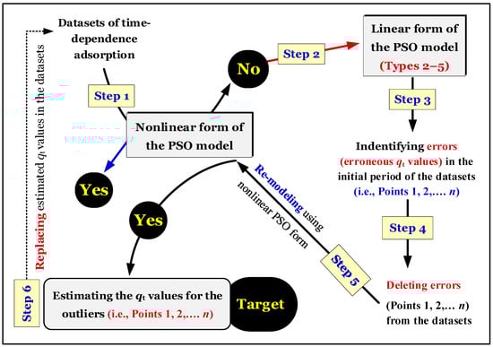 Applying the nonlinear optimization method for modelling the time-dependent experimental data is recommended. However, this nonlinear method does not provide relevant information on errors in the experimental points (potential outliers). This method should only be applied after the outliers are identified and removed. Results showed that the utilization of the linear forms (Types 2–5) of the PSO model was appropriate for identifying errors in the experimental points (at the initial adsorption period) of time-dependent adsorption. This conclusion is valid when the plot of qt vs. t indicates two regions: kinetics and equilibrium (equilibrium is a plateau region).