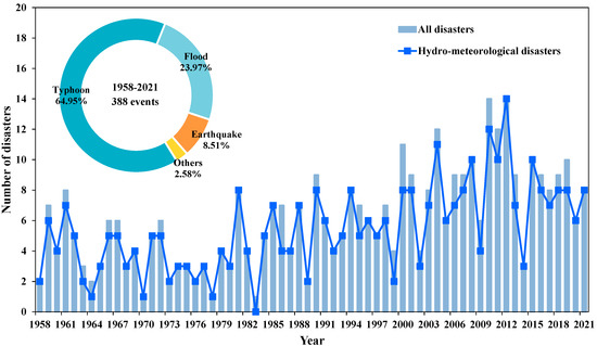 Figure 1 presents the statistics for natural disasters in Taiwan from 1958 to 2021 [32]. In Taiwan, natural disasters have become more frequent. Among the many different forms of disasters, including typhoons (64.95%), floods (23.97%), earthquakes (8.51%), and miscellaneous disasters (2.58%), hydro-meteorological disasters were the most common. Moreover, 97.42% of hydrometeorological disasters (rainfall- and earthquake-related disasters) directly or indirectly caused landslide hazards. Potential debris flow torrents (2021) in Taiwan have been identified by the Soil and Water Conservation Bureau (SWCB) of the Council of Agriculture (COA), while the geologically susceptible sites for landslides and landslips have been identified by the Central Geological Survey of the Ministry of Economic Affairs (Figure 2). Geologically sensitive landslides and landslips are defined as sites where landslides or landslides have occurred, and the surrounding region has been impacted by landslides or landslides. These areas are delineated by the central competent authority. Most areas in Taiwan are exposed to hillslope hazards, and these disasters tend to occur between July and September due to southwest airflow and typhoon events, with concentrated rainfall in May and June (the rainy season).