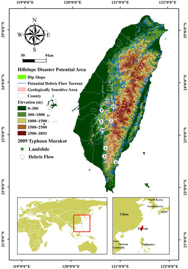 - Lin, C.-W.; Chang, W.-S.; Liu, S.-H.; Tsai, T.-T.; Lee, S.-P.; Tsang, Y.-C.; Shieh, C.-L.; Tseng, C.-M. Landslides triggered by the 7 August 2009 Typhoon Morakot in southern Taiwan. Eng. Geol. 2011, 123, 3–12. [Google Scholar] [CrossRef]