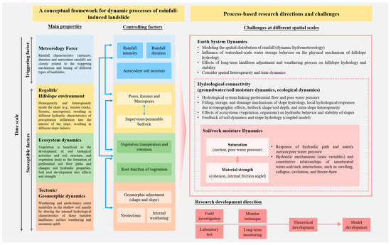 There have been numerous studies on hillslope hydrology, including the conceptualization of hydrological runoff processes on hillslopes [118,119,120] and the analysis of forms and functions of hillslope hydrology based on flow observation [94,121]. However, understanding the mechanism underlying hillslope hydrology that triggers landslides remains a challenge [20]. This challenge is primarily due to the dynamic nature of hydrological processes, which depend on the complex interactions between rainfall characteristics, soil and bedrock properties, local geomorphology, and biosystems (Figure 3). Hillslope instability is promoted by such dynamic behaviors, specifically interactions between multiple features that have co-evolved on diverse spatiotemporal scales [14,20]. Rainfall infiltration and impermeable or permeable bedrock are local factors triggering hillslope failure [122]. Geohydrological processes are influenced by dominant flows and bedrock topography [123,124,125,126], and hillslope failure often occurs during hydrological interruptions. Therefore, to ensure hillslope stability, hydrological monitoring should focus on changes in soil moisture and pore water pressure. Early warning mechanisms and evaluation models should be developed for hillslope hydrology processes and stability. However, there have been no models in which hillslope stability is associated with complex hydrological processes, mainly because the hydrological mechanisms are distinct from those for landslides [20] and because of spatial variability. In situ monitoring of landslide regions is also challenging [127].