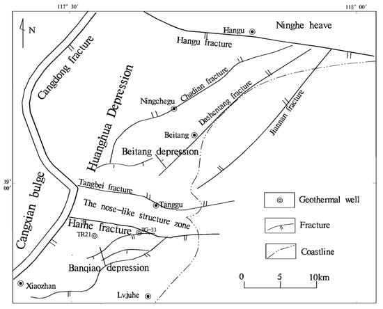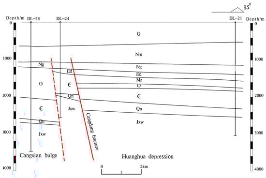 The whole length of the Cangdong fracture, from north of Huaizhuang village in the Ninghe district to south of Hulianzhuang in the Jinghai district and into Hebei province, is about 200 km. The length of the northern section in Tianjin is about 120 km, the strike is north-north-east, the dip is south-east-east and the dip angle is 30–48° []. The cutting depth is more than 10 km; it cuts through the silicon and magnesium layers of the whole crust, breaks off to the upper mantle, and cuts up to the Minghuazhen formation of Neogene []. It controls the development of Mesozoic and Cenozoic basins and forms the boundary between the Cangxian bulge and Huanghua depression []. The west plate of the Cangdong fracture is the Cangxian bulge, and the basement roof of the Cangxian bulge is mainly Paleozoic and Meso-neoproterozoic, the buried depth of the bedrock roof is 800~150 m and the upper part is Paleogene of the Cenozoic, which is almost absent. The east plate of the Cangdong fracture is the Huanghua depression. The bedrock roof of the Huanghua depression is mainly Mesozoic and Late Paleozoic. The buried depth of the Dongying formation in the east plate of the Cangdong fracture is similar to the Mesozoic, Cretaceous and Cambrian formations in the west plate of the Cangdong fracture. The Dongying formation near the Cangdong fracture is relatively thin, and the formation conditions for making up and draining the Dongying geothermal reservoir through the Cangdong fracture are poor.