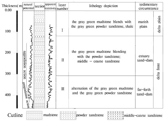 The Dongying formation deposition in this area is mainly a set of terrigenous clastic sediments with mudstone and siltstone, including feldspar, quartz and a small amount of debris. From a view of the sedimentary sequence, the debris particle sizes become gradually larger from the bottom to the top. The Dongying III segment at the bottom is black/dark brown mudstone; its upper part is gray-green mudstone, siltstone and increasingly clastic. The upper part of the Dongying II segment is middle-coarse sandstone, which is a sedimentary anti-cyclic sequence, and is an important feature of the delta sediments [,]. The profile curve of geophysical prospecting (Figure 3) can also reflect changes in sedimentary sequence. Combining the sediment characteristics, which are the low ratio of sand and mud, the more indicative marine fossils and so on, it can be seen that Dongying’s terrigenous clastic deposits in this area are the delta sediments controlled by rivers [,].