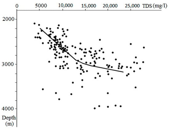 The chemical composition of the geothermal fluid is formed by long-term exchange with the surrounding rock. The chemical characteristics of Dongying geothermal fluid in the Huanghua depression are affected by many factors, such as lithology, stratigraphic structure, distance between recharge and drainage, fault structure and so on. The relationship between salinity and the burial depth of Paleogene geothermal fluid in the Huanghua depression is very close, mainly manifested in the increase in burial depth and the increase in the salinity of the geothermal fluid. The relationship is nearly a linear relationship between the total dissolved solid (TDS) and burial depth (Figure 4) []. The amplitude increase is slowed down at depth, mainly because the geothermal water recharge cycle at the deeper part is weaker than that at the upper part, and the salinity of geothermal fluids is reduced due to the dehydration of clay minerals in the overpressure zone [].