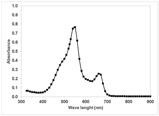 Likewise, local wastewater regulations [] sets the wavelengths of 436, 525 and 620 nm as absorbance references for color measurement of wastewater discharge. UV–Vis spectrum of clinical laboratory wastewater is shown in Figure 1; peaks at 540 nm and 660 nm are identified, corresponding to crystal violet and methylene blue, respectively. The highest absorbance peak obtained was at 0.8 in the 500 and 550 nm wavelength range; therefore, 525 nm wavelength was selected as a reference value to track the degradation process in order to follow local regulation guidelines for color parameter in wastewater.