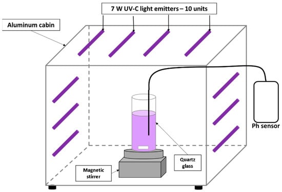 Discoloration process measurement (A/A0) was determined using the spectrophotometric technique, measuring wastewater absorbance during reaction (A) and comparing it with initial wastewater absorbance (A0). Wastewater discoloration reaction was carried out in a 200 mL quartz glass located inside an aluminum box with internal illumination. Initial wastewater volume was maintained at 100 mL. A 30% hydrogen peroxide solution was used as electron acceptor, concentration was maintained constant at 10 mM in all experiments using this reactive. Sunlight and visible white light (400 to 700 nm range) effect was executed with the same quartz glass located outside the aluminum box. Agitation was carried out using a Heidolph model MR 3001 magnetic stirring plate (Figure 2), every half hour a 10 mL aliquot was taken to measure absorbance and pH of wastewater, a 5 min centrifugation process was executed previous to measurement to eliminate suspended solids generated by ilmenite agitation inside the solution, avoiding solid interference with the absorbance reading. Absorbance was measured in a Thermo Fisher Scientific reference Genesys 20 model 4001/4 spectrophotometer at a wavelength of 525 nm. pH was determined in an Orion model SA520 pH meter. Type C—UV light was (254 nm) generated by 10 Sylvania model 7 W lamps and type A UV light was generated by 10 JeneralTek® model F8T5-BLB 7 W lamps located inside the box.
