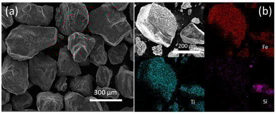 EDS elemental mapping for Fe, Ti, and Si is shown in Figure 4b. It confirms that natural ilmenite samples are mainly constituted of Ti and Fe compounds and that its distribution is homogenous in most of the particles. Results also show that Si is not as well-distributed as Ti and Fe, meaning it could probably be a contamination from the mining site.