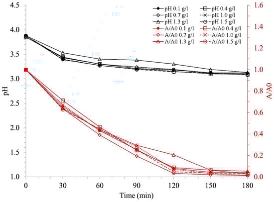 Effect of ilmenite loading on discoloration (A/A0) and pH. ([H2O2] = 10 mM, pH0 = 3.8, UV-C Light).