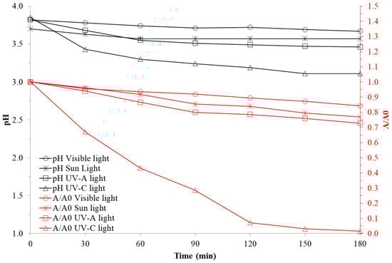 Figure 6 shows that UV-A light presented better performance than sunlight and visible light photocatalytic process; however, only 20% discoloration was obtained after a 3 h reaction, which significantly differs from the 98% discoloration obtained when UV-C light was used.