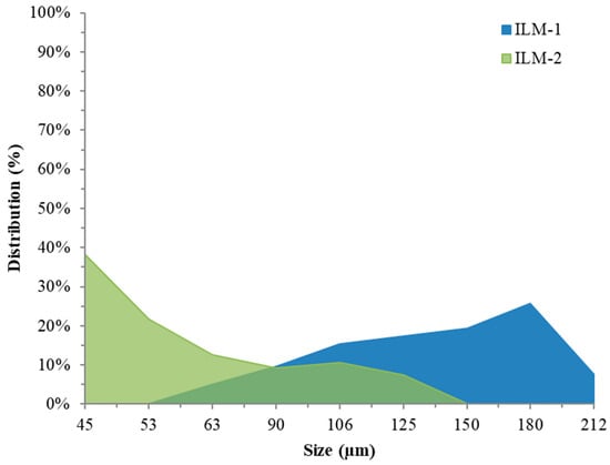 Figure 7 represents the percentage size distribution found for the crushed sample, as the sample was sieved together with uncrushed material it was determined that size 1 (ILM-1) corresponds to ilmenite in its natural state which has a particle size between around 100 and 400 μm; subsequently, size 2 (ILM-2) was obtained, which corresponds to the interval between around 40 and 100 μm; particle size of less than 50 µm accounts for 60% of total particle size distribution after the crushing process.