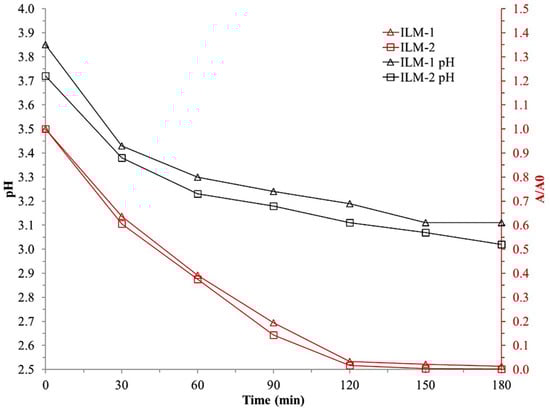 When reviewing the pH behavior during the reaction, it is evident that the solution treated with ILM-1 presented a pH one unit higher than the solution treated with ILM-2, which allows inferring that the acidification of the solution is promoted during the discoloration when the particle size of the ilmenite is reduced. The ILM-2 degradation shows an interesting behavior; it reaches comparable or higher discoloration than the ILM-1 sample at shorter times (see Figure 8).