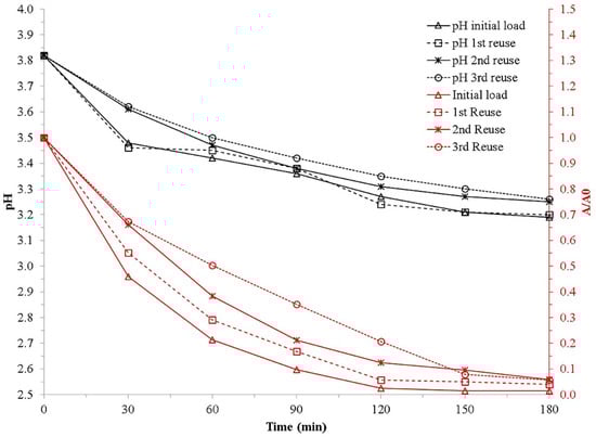 The behavior of each of the ilmenite reused is shown in Figure 9, in which the loss of efficiency of the discoloration process is observed as the mineral is reused. Nevertheless, in all cases, discoloration percentages of more than 90% were obtained after 3 h of reaction, indicating that the ilmenite is relatively reliable. The same discoloration behavior can be seen in the behavior of the pH of the wastewater solution, which showed a progressive decrease in acid formation as the material was reused.