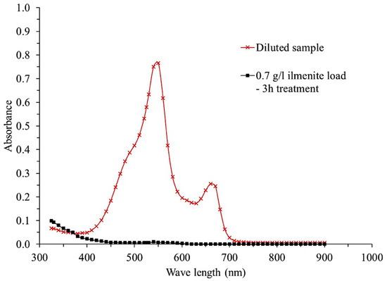 Finally, diluted wastewater treated with an ilmenite loading of 0.7 g/L was spectrally scanned from 325 to 900 nm to compare it with the initial wastewater solution. Figure 10 represents the spectral sweep of initial wastewater solution compared with the final treated solution, clearly showing a complete elimination of the absorbance of the solution in the entire visible spectrum. However, as it approaches the ultraviolet spectrum, the solution begins to show an increase in its absorbance values, which indicates the presence of species resulting from the degradation of the dyes and agrees with the 50% COD degradation value obtained.