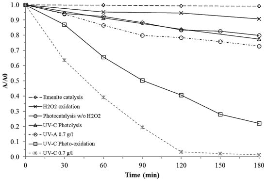 Finally, discoloration blanks were performed on the wastewater solution using only hydrogen peroxide at the 10 mM concentration (oxidation), ilmenite at the load with the best color degradation (ilmenite catalysis), UV-C light radiation (photolysis), and ilmenite with ultraviolet light (photocatalysis without hydrogen peroxide) to compare their performance against the photocatalytic discoloration process.