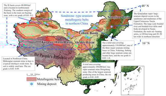 Based on the above, this article describes geo-environmental models of sandstone-type uranium in northern China, which covers the changes in the Earth’s environment before, during and after mining, and discusses the prospects of geo-environmental protection and restoration methods in the future. Section 2 describes the distribution of sandstone-type uranium in northern China and summarizes the Earth’s environmental characteristics and baselines of these deposits. Section 3 concentrates on the soil, rocks and groundwater chemical anomalies, as well as radiation and vegetation environment changes. The environmental measures during and after mining are addressed in Section 4. Finally, Section 5 provides suggestions for the geo-environmental protection and remediation of sandstone-type uranium mine development.