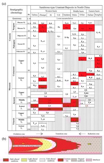 Stratigraphic chronology of stone-type uranium deposits in northern China (a) and a sketch of the oxidation-reduction zone (b) in the metallogenic belt. T-H means Turpan-Hami Basin.