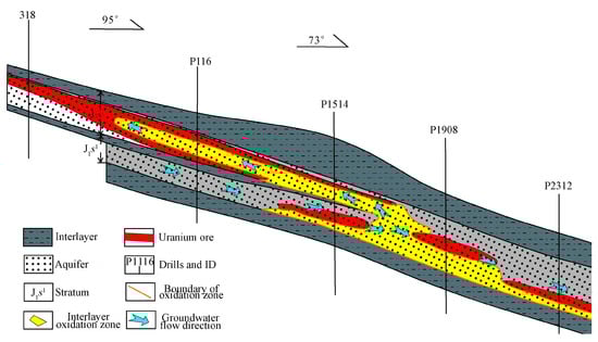 Multilayer aquifer systems are universal in all these deposits [,,,]. For example, the Qianjiadian uranium deposit in the Songliao Plain has four aquifers with an average thickness of 55 m [], and the Shihongtan deposit in the Turpan-Hami Basin has seven aquifers with an average thickness of approximately 23 m []. The aquifer is often composed of light gray or reddish gravelly sandstone mixed with argillaceous cementation. Dense and continuous groundwater barriers are usually composed of mudstone with a thickness of 1–6 m [,,,]. These aquifers determine the ore occurrence characteristics through the control of redox conditions and then affect the geo-environment of the deposits (Figure 3). Similar to the metallogenic differences between the eastern and western Shihongtan ore belts [], the uranium occurrence differences in the northern and southern Ili Basin [] are all related to the interlayer oxidation of groundwater.