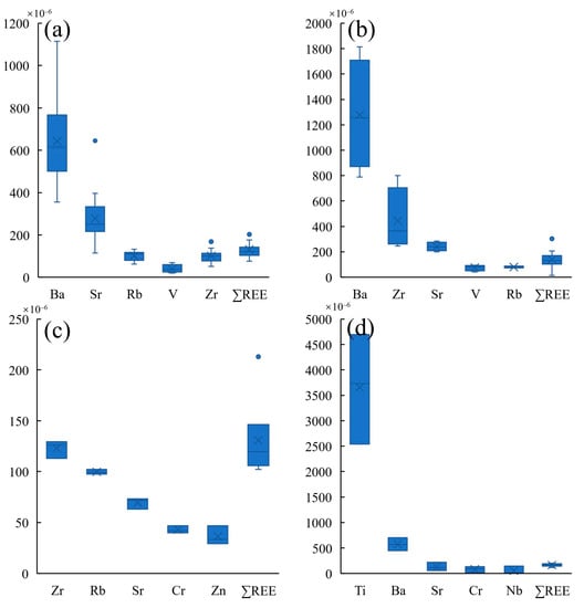 Statistics of the main trace elements and ∑REEs in each ore zone (10−6) (a) for Qianjiadian in the Songliao Basin; (b) for Dongsheng in the Ordos Basin; (c) for Shihongtan in the Turpan-Hami Basin; and (d) for the southern edge of the Ili Basin [,,,,,,].