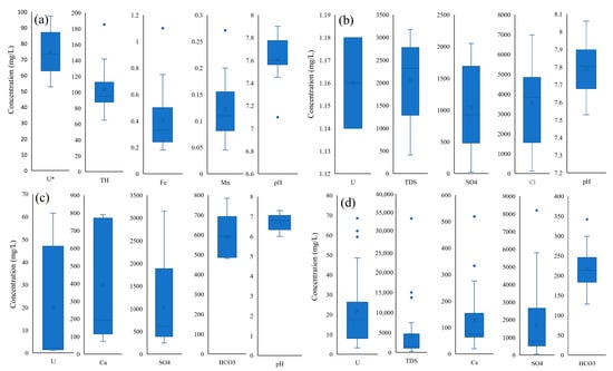 Representative constant elements of groundwater in the ore belt (a) for the Songliao Basin; (b) for the Ordos Basin; (c) for the Turpan-Hami Basin; and (d) for the Ili Basin. The pH is unitless, and * represents μg/L [,,,,,,,,,,,,,,].