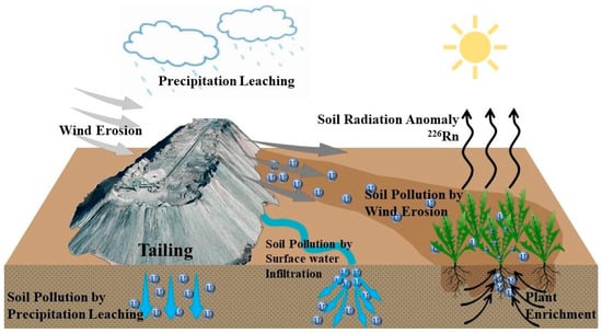 Soil chemical anomalies usually originate from eroding and leaching tailings rather than production (Figure 6). Wind-borne pollution and water leaching are the main sources of pollution []. Wind propagation affects a wide range, but pollution is generally only distributed on the soil surface. For example, in a U-Th tailing in northern China [], the radioactive elements U and Th were abnormally high in the southeast of the tailing due to the prevailing northwest wind. The content of U in the downwind soil was 2.65 times the background value and 1.61 times the upwind value. The soil pollution from tailings spread to approximately 4 km but was basically distributed within 10 cm of the surface. The water leaching range is small, but the vertical effect is deeper. For example, in a tailing pond [], the U content reached its peak at 8.5 m from the surface due to perennial precipitation leaching. The maximum migration depth reached 14 m.