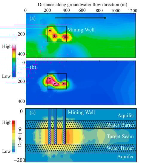 Schematic view of the groundwater pollution halo. The black square delineates the range of the mine, and the dots indicate the mining wells. (a) shows the pollution halo of primary high-concentration pollutants, such as SO42−, Fe, and U; (b) shows the horizontal pollution halo of low-concentration pollutants, such as Cl−, NO3− and other heavy metals; (c) shows the vertical pollution halo; the data were interpolated from the measurement of a decommissioned uranium mine in Northwest China.