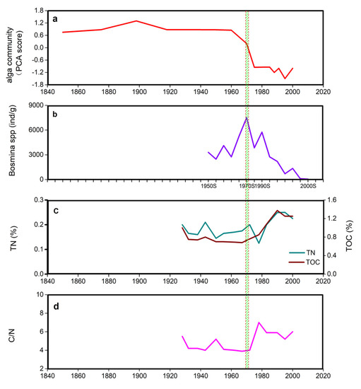 Historical records of lake sediment-based aquatic system response variables (The dotted box represents tipping points of the lake sediment-based aquatic system response variables). (a) Silicon alga composition in sediment; (b) density of Bosmina spp. species in sediment; (c) TN and TOC in sediment(%); (d) C/N in sediment.