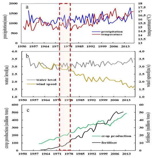 Historical records of environmental drivers during the period 1840–2017 (The dotted box represents tipping points of the lake sediment-based aquatic system response variables). (a) Temperature; (b) water level and wind speed; (c) grain production and fertilizer.