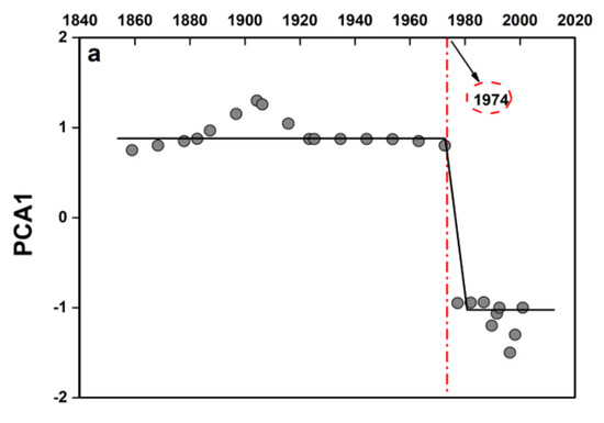 The results of STARS mutation detection show that there was a downward mutation in the PCA1 time series in 1974 (Figure 4a). In order to further prove the existence of the mutation point, a set of autoregressive integrated moving average (ARIMA (p, d, q)) models were fitted using the Stats package of R software, where p is the autoregressive (AR) order, q is the moving average (MA) order, and d is the differential part of the 1850–1960 PCA1 time series. Based on the minimum Akaike information criterion (AIC), the evolution process of the PCA1 time series from 1970 to 2000 was predicted, and ARIMA (1,1,2) was selected as the optimal model for the PCA1 time series (Table 1). The predicted values for 1970–2000 (red lines represent 95% confidence intervals), observed values (solid black lines), and predicted values (circles) are significantly different within the 95% probability level (Figure 4b); this indicates that the abrupt change observed in the 1970s cannot be predicted by a linear model, further proving the existence of an ecosystem break point. Furthermore, the value of PCA1 decreases dramatically from about 0.9 to −0.9 (Figure 4a). Compared with Figure 4b, it can be seen that in the absence of strong external interference, the value should have been within the predicted range instead of the mutation range. In addition, the probability density function (Gaussian kernel density estimate) from 1850 to 2000 indicates the existence of bistability in the ecosystem, with short vertical bars indicating the density of individual points (Figure 4b). This indicates that the ecosystem of Tai Lake has undergone dramatic mutation in the past 150 years, with a significant increase in eutrophic planktonic diatoms in its sediments [26] and a rapid decrease in the clean-tolerant species Bosmina spp. (Figure 4c). Overall, these results indicate that the ecosystem of Tai Lake underwent large-scale mutation and rapid reorganization in the 1970s.