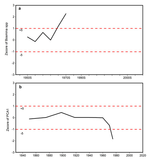 In addition, the PCA1 and Bosmina spp. data were normalized based on their means and standard deviation using the function Z-score (X) in MATLAB software. The obtained Z-score values indicate the variability of the PCA1 and Bosmina spp. time series data. Before the 1970s, the Z-score value fluctuates within a relatively low range of one standard deviation, and a sudden jump occurs in the 1970s, exceeding the range of one standard deviation, indicating that the state of the Tai Lake ecosystem suddenly changed in the 1970s (Figure 5).