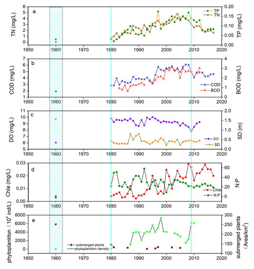 Time series of water quality indicators between 1960 and 2011~2017 in Tai Lake (The dotted box was used to highlight 1960, and the blue and green lines were used to mark time nodes of water environment change). (a) Total nitrogen and total phosphorous; (b) chemical oxygen demand and biological oxygen demand; (c) dissolved oxygen and transparency; (d) chla, ratio of nitrogen to phosphorous; (e) phytoplankton and submerged plants.