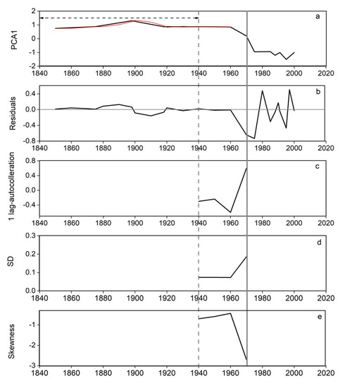 Potential early warning signals of a regime shift in the lake’s trophic state for PCA time series. (a) PCA1 scores of sediment diatom composition (derived from Figure 2) (The red line is the Minitab curve after filtering out the slow trend, and the arrow indicates the width of the moving window used to calculate the warning signal); (b) residuals of PCA1 (the gray line indicates zero); (c) lag-autocorrelation of (b); (d) SD of (b); (e) skewness of (b) (the solid gray vertical line indicates the 1970s).