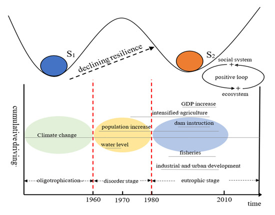 However, after 1960, the balance between the ecosystem of Tai Lake and the social system surrounding the basin has gradually been broken. The pressure of population growth and the increasing demand for food has led to an increase in the intensity of agricultural activity in the Tai Lake basin, such as the Great Leap Forward in 1958–1961 and the People’s Commune Movement in 1958–1982 [40], which were marked by large-scale wetland reclamation and a campaign to build farmland around the lake. As a result, the lake area has shrunk, and nutrients have been discharged into the lake. At the same time, the water level of Tai Lake declined from 1965 to 1970, which further aggravated the degradation of the ecological environment. In the 1970s, fluctuation in the environmental, chemical, and physical processes of Tai Lake led to significant changes in its species composition (Figure 7a) and food web structure. The system elasticity continuously decreased, and steady-state mutation of the ecosystem from an oligotrophic state to a eutrophic state occurred (upper part of Figure 9).