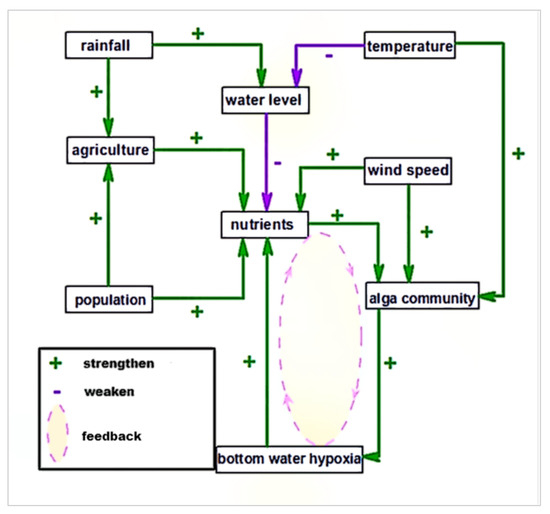 The figure describes the occurrence of eutrophication (Figure 6) after the 1980s. At this time, a positive feedback loop (dotted ellipse) of phosphorus in the sediments circulating in the lake water was firmly established. The figure shows the diversity and interconnectivity of the main external drivers (bold) of the algal community in Lake Tai, with typical relationships (positive and negative) shown for major interactions. This figure is modified from Wang et al., 2012 [16].