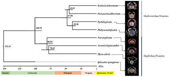 Phylogenetic cladogram and divergence time estimation of eight species in superfamily Leucosioidea.