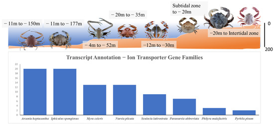 Infraorder Brachyura, also called the “true-crab”, is the largest and most diverse clade of the Decapoda group with over 7400 species [13]. These crabs contribute to the health and sustainability of ecosystems [14]. Due to the divergence of their morphology, organ structure and function, they can adapt to different habitats, increasing their habitat diversity [14,15]. Moreover, crabs are the main component of the macrobenthos community. Our previous studies also indicated that benthic crabs are one of the indicator species in intertidal regions, such as wetland and mangrove environments [3,16]. Therefore, the value of the biodiversity of crabs is important to study. Recently, research on the biodiversity conservation of crabs, community ecology, and species diversity have been focused on. The molecular data of crabs have been widely revealed in previous studies, including the sequences of single and short fragments, and mitochondrial genome and whole genome data; these data have been mainly applied to understand systematic and genetic mechanisms, physiological regulation, and genetic selection [17,18,19,20,21,22,23,24], but studies on gene diversity and the environmental adaptation mechanism between species or communities are relatively lacking. Notably, the regulation mechanism of how crabs change their habitat from sea to land is an important key to understanding the evolution of crabs. Traditionally, morphology and physiology have been explored to explain the habitat adaptation of crabs [25,26,27]. In recent years, several reports on the regulation of osmotic pressure on the gene level have also been published. According to the results, ion transporter gene families are one candidate gene of regulation during salinity transitions in sea water [28,29,30]. Therefore, the composition and expression of ion transporter gene families carried by marine organisms are valuable to use in the study of environmental adaptation.