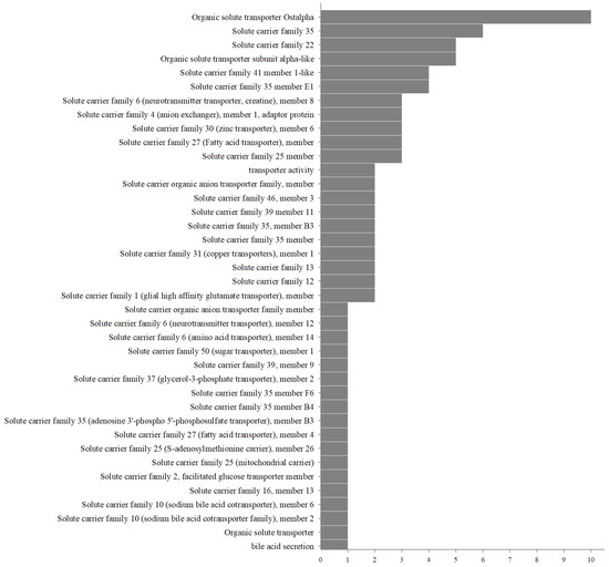 In a further analysis of the gene subfamilies, the number of gene members of the organic solute transporter ostalpha was the highest, and the solute carrier family, numbering 35, was second. The third subfamily was the solute carrier family, numbering 22, followed by the organic solute transporter subunit alpha-like (Figure 3). Among them, the function of organic solute transporter ostalpha has been described in previous studies. Their main mechanism consists of regulating the balance of the concentration of Na+ and K+ between the organism cell and its environment [48,49]. This shows that the function gene that regulates ion concentration has a candidate gene family for the environmental adaptation of leucosiid crabs. Hence, we will analyze these gene families in future studies to understand the mechanism of deep adaptation regulation in crabs.
