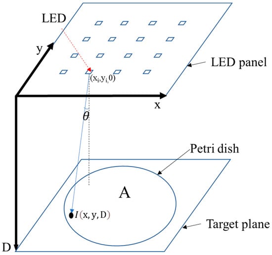 As shown in Figure 3, D is the distance between the Petri dish and the LED panel, x and y are the coordinates of the point, in terms of the Petri dish plane, where the light intensity needs to be calculated; is the light intensity at a coordinate of (x, y, D); θ is the view angle, which is equal to arctan ; is the reference light intensity for each LED lamp with a zero view angle and a reference distance (); and are the coordinates for ith LED lamp; m is the number of LED lamps; Re (θ) is the radiation directivity function for the LED lamp, which is defined as the ratio between light intensity with a view angle θ and the light intensity with a view angle of zero at the same distance from the light source; A is the area of the Petri dish.