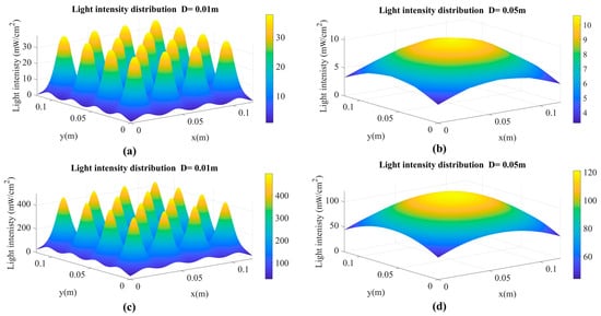 Light intensity distribution for the 280 nm LED reactor and 405 nm LED reactor (input current = 500 mA): (a) 280 nm LED reactor, D = 0.01 m; (b) 280 nm LED reactor, D = 0.05 m; (c) 405 nm LED reactor, D = 0.01 m; (d) 405 nm LED reactor, D = 0.05 m.