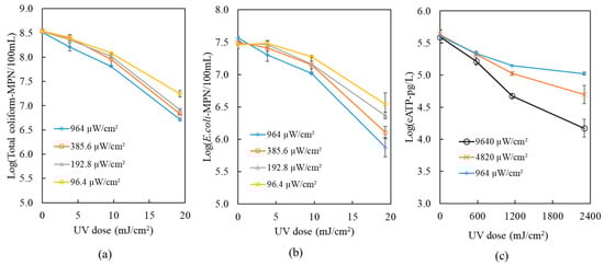 The UV dose per log reduction values of cATP, total coliforms and E. coli were estimated using Equation (5), and the results are summarized in Table 3.