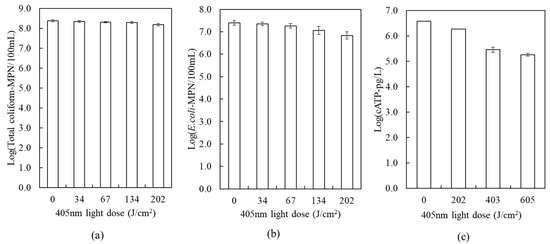 Disinfection of secondary wastewater effluent by the 405 nm LED: (a) total coliform log reduction, (b) E. coli log reduction, (c) cATP log reduction.