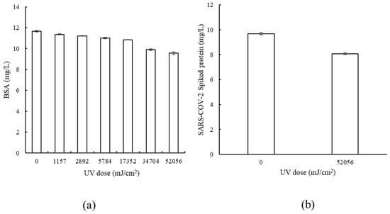 The impact of 280 nm LED irradiation (9640 µW/cm2) on protein concentrations in wastewater: (a) BSA, (b) SARS-CoV-2 spike protein.
