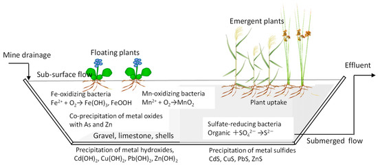 The Ministry of Economy, Trade, and Industry, Japan (METI) and the Japan Oil, Gas and Metals National Corporation (JOGMEC) published a guidance of passive treatment for mine-drainage treatment in 2021 [5,6]. As a passive technology, constructed wetlands (CWs) incorporating physical, chemical, microbial, and botanical processes are promising candidates for the sustainable treatment of mine drainage. CWs for AMD have been reviewed by several researchers [7,8,9,10]. Figure 1 displays the conceptual mechanisms of metal removal in CWs. In CWs, the predominant mechanisms for metal removal are different under various types of mine drainage. With an increase in the pH, the metal hydroxides of Cu, Pb, Zn, and Cd precipitate in CWs filled with alkaline substrates such as limestone and seashells. Under oxidative conditions, dissolved Fe and Mn are biochemically oxidized to metal oxides, resulting in co-precipitation with other metals such as Zn and As. Under reductive conditions, Pb, Zn, Cd, and Cu precipitate as metal sulfides by the microbial mediation. The selection of wetland plants is eventually affected by the characteristics of the mine drainage. CWs are beneficial irrespective of the usage of other processes. As a pretreatment for physicochemical processes, CWs can adjust the pH value and reduce the drainage amount through evapotranspiration. As a post-treatment with a low operational cost, a CW can remove the remaining metals from the effluent of the major physicochemical processes.