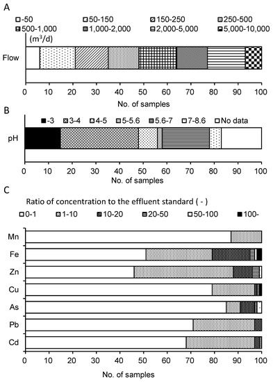 Average characteristics of 100 mine drainages in Japan (2014–2016). Flow rate (A), pH (B), and ratio of metal concentration to the effluent standard in Japan (Cd: 0.03 mg/L, Pb: 0.1 mg/L, As: 0.1 mg/L, Cu: 3 mg/L, Zn: 2 mg/L, soluble Fe: 10 mg/L, and soluble Mn: 10 mg/L) (C).