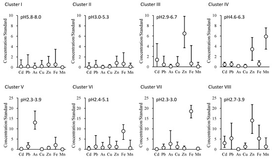 The ratio of the metal concentration to the effluent standard (Cd 0.03 mg/L, Pb 0.1 mg/L, As 0.1 mg/L, Cu 3 mg/L, Zn 2 mg/L, soluble Fe 10 mg/L, and soluble Mn 10 mg/L) in Clusters I–VIII of mine drainage in Japan (2014–2016) (Figure 3). Average plots and bars for maximum and minimum values are displayed in detail.