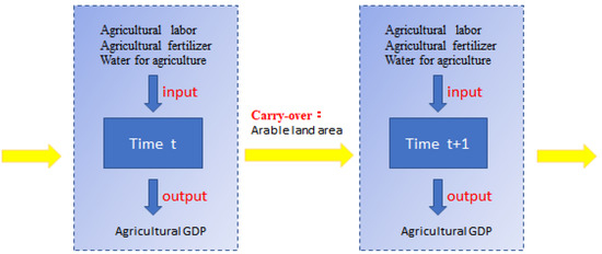 The study is based on 30 administrative regions in China, i.e., 30 DMUs (j = 1, …, 30); there are 3 inputs (i = k, l, m) in each of the 30 DMUs, where i is agricultural labor, agricultural fertilizer, and agricultural water, and there is 1 output (j = o) of agricultural GDP; and agricultural arable land area is the carry-over. Since arable land area is a non-controllable factor, the carry-over (fix) non-variable model is used in this study.