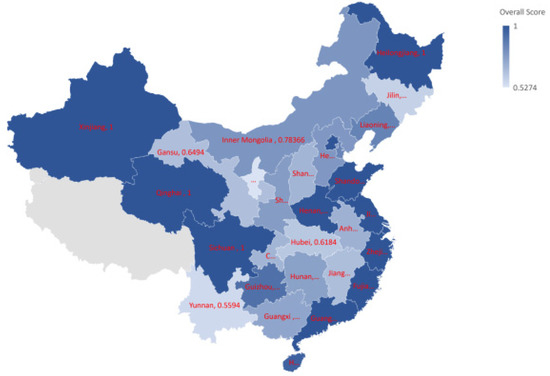 During the five-year period, the annual efficiencies of Tianjin were 0.527, 0.686, 1, 1, and 1, respectively, and the overall efficiency increased by 89.75%, indicating that Tianjin adopted effective resource allocation to improve efficiency. In addition, the annual efficiencies of Jilin were 0.549, 1, 0.528, 0.452, and 0.405. Except for the best resource allocation in 2013, the resource allocation in the other years did not improve significantly, and so it has a lot of room to adjust resource allocation to improve agricultural efficiency. The overall efficiency of China’s agriculture after the input of agricultural water is 0.910, and the average annual efficiency value of each sub-point is between 0.88 and 0.946. Its overall efficiency and annual efficiency are better than the efficiency performance of unused agricultural water. The overall efficiency values of 17 administrative regions, including Beijing, Tianjin, Inner Mongolia, Jilin, Heilongjiang, Shanghai, Jiangsu, Zhejiang, Fujian, Shandong, Henan, Chongqing, Sichuan, Guizhou, Shaanxi, Qinghai, and Xinjiang, are at the forefront of efficiency, and they have the best agricultural efficiency performance (see Figure 4).
