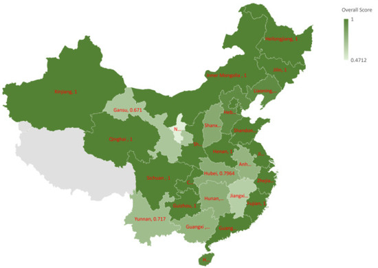 The efficiency values of 10 administrative regions, including Beijing, Heilongjiang, Shanghai, Jiangsu, Zhejiang, Fujian, Shandong, Sichuan, Qinghai, and Xinjiang, are at the forefront of efficiency and have the best agricultural efficiency performance. The efficiency values of six administrative regions, including Tianjin, Liaoning, Guangdong, Henan, Hainan, and Guizhou, are above the level of 0.834, but are not at 1. The efficiencies of Guangdong and Henan remain stable at 0.999. In addition, 14 regions, including Hebei, Shanxi, Inner Mongolia, Jilin, Anhui, Jiangxi, Hubei, Hunan, Guangxi, Chongqing, Yunnan, Shaanxi, Gansu, and Ningxia (see Figure 3), are below the level of efficiency, of which Yunnan (0.5598), Jilin (0.5449), and Ningxia (0.5275) have the lowest efficiency.
