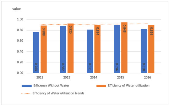 From Figure 5, we can see that the difference in agricultural efficiency in China between 2012 and 2016 is better than that of the annual rate after agricultural water was used (0.888, 0.925, 0.894, 0.946, and 0.896, respectively), which was better than the efficiency of unused agricultural water (0.763, 0.882, 0.811, 0.896, and 0.818, respectively).
