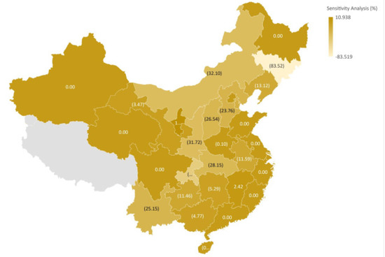 After the input of agricultural water, the agricultural efficiency of the 17 administrative regions of Tianjin, Hebei, Shanxi, Inner Mongolia, Liaoning, Jilin, Anhui, Henan, Hubei, Hunan, Guangxi, Hainan, Chongqing, Guizhou, Yunnan, Shaanxi, and Gansu was seen to have increased. The agricultural efficiency value of Jilin rose from 0.545 to 1, or an increase of 83.52%, and Chongqing, Inner Mongolia, Shaanxi, and Hubei also increased by 47.21%, 32.10%, 31.72%, and 28.15%. They are the five administrative districts with the most efficiency gains, indicating that agricultural water use is positive for their efficiency. However, the agricultural efficiency of Jiangxi and Ningxia declined by 2.42% and 10.49%, and it is necessary to manage agricultural water in particular to improve their overall efficiency of agriculture (see Figure 6).